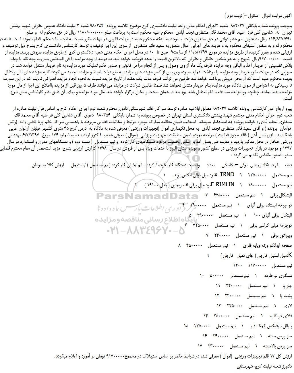 بموجب پرونده شماره بایگانی 982037 شعبه 2اجرای احکام مدنی واحد نیابت دادگستری کرج موضوع کلاسه پرونده 980354 شعبه 2 نیابت دادگاه عمومی حقوقی شهید بهشتی تهران له: شاهین گلی فرد علیه: آقای محمد قائم منتظری نجف آبادی محکوم علیه محکوم است به پرداخت مبلغ 1180/000/000 ریال در حق محکوم له و مبلغ 116/827/490 ریال به عنوان نیم عشر دولتی در حق صندوق دولت با توجه به اینکه محکوم علیه در مهلت قانونی در مهلت مقرر نسبت به انجام مفاد حکم اقدام ننموده است بنا به درخواست محکوم له و به منظور استیفای محکوم به و هزینه های اجرایی اموال متعلق به سعید قائم منتظری از سوی این اجرا توقیف و توسط کارشناسی دادگستری کرج بشرح ذیل توصیف و ارزیابی شده و مقرر گردیده از طریق مزایده در مورخ 11/5/1399 از ساعت9 صبح تا 10 در محل اجرای احکام مدنی شعبه دادگستری کرج از طریق مزایده بفروش برسد. مزایده از قیمت 917000/000ریال شروع و به هر شخص حقیقی و حقوقی که بالاترین قیمت را بدهد فروخته خواهد شد. ده درصد از وجه مزایده را فی المجلس بصورت وجه نقد یا چک بانکی تضمینی از خریدار اخذ و الباقی وجه مزایده ظرف یک ماه از وی وصول و پس از انجام مراحل قانونی و صدور حکم تملیک مورد مزایده به نام خریدار منتقل خواهد شد. در صورتی که در مهلت مقرر خریدار وجه مزایده را پرداخت ننماید سپرده وی پس از کسر هزینه های مزایده به نفع دولت ضبط و مزایده تجدید می گردد. کلیه هزینه های نقل وانتقال بعهده محکوم علیه است که از محل فروش پرداخت خواهد شد طرفین می توانند ظرف مدت یک هفته از تاریخ مزایده نسبت به نحوه انجام مزایده اعتراض نمایند که در این صورت تا رسیدگی به اعتراض از سوی دادگاه مورد مزایده بنام خریدار منتقل نخواهد شد ضمنا طالبین شرکت در مزایده می توانند ظرف 5 روز قبل از مزایده بااطلاع این اجرا از مال مورد مزایده بازدید نمایند. چنانچه روزمزایده مصادف با ایام تعطیل باشد روز بعد در همان ساعت و مکان برگزار خواهد شد. مال مورد مزایده و بهای آن طبق نظر کارشناس بدین شرح است: