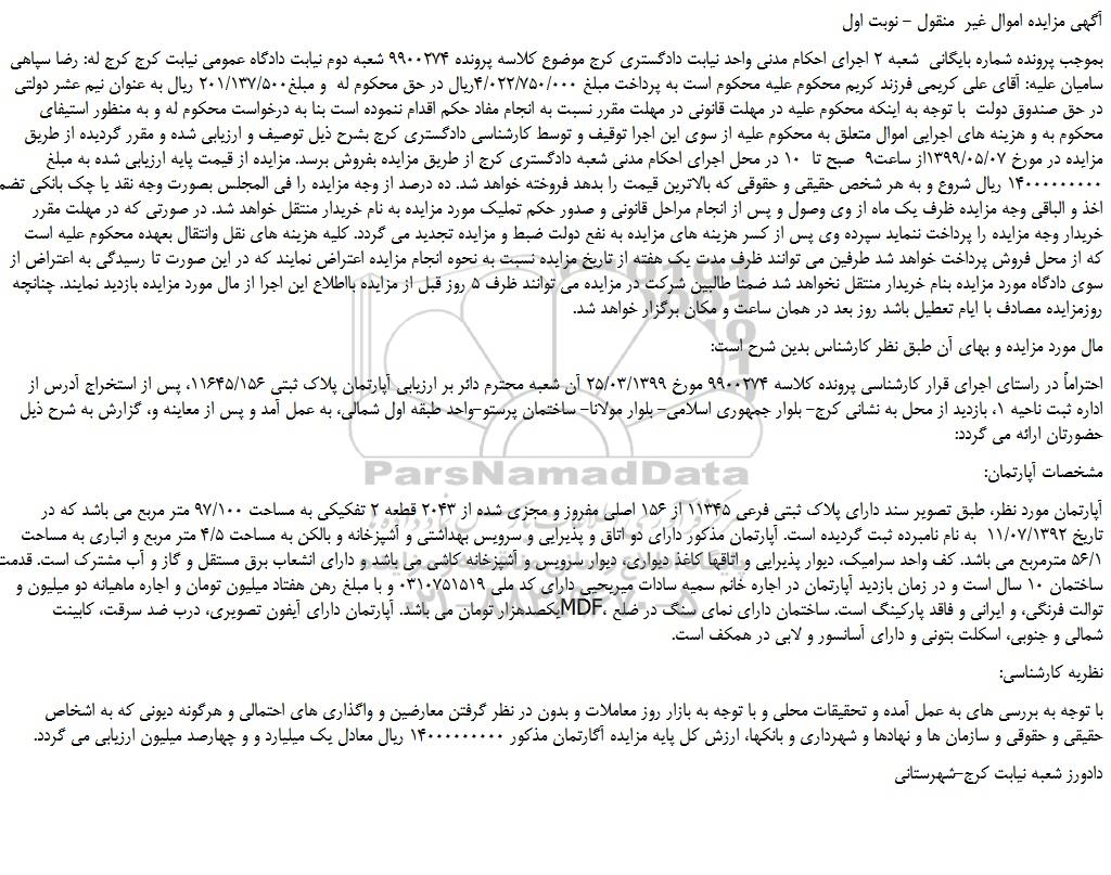 بموجب پرونده شماره بایگانی شعبه 2 اجرای احکام مدنی واحد نیابت دادگستری کرج موضوع کلاسه پرونده 9900274 شعبه دوم نیابت دادگاه عمومی نیابت کرج کرج له: رضا سپاهی سامیان علیه: آقای علی کریمی فرزند کریم محکوم علیه محکوم است به پرداخت مبلغ 4/022/750/000ریال در حق محکوم له و مبلغ201/137/500 ریال به عنوان نیم عشر دولتی در حق صندوق دولت با توجه به اینکه محکوم علیه در مهلت قانونی در مهلت مقرر نسبت به انجام مفاد حکم اقدام ننموده است بنا به درخواست محکوم له و به منظور استیفای محکوم به و هزینه های اجرایی اموال متعلق به محکوم علیه از سوی این اجرا توقیف و توسط کارشناسی دادگستری کرج بشرح ذیل توصیف و ارزیابی شده و مقرر گردیده از طریق مزایده در مورخ 1399/05/07از ساعت9 صبح تا 10 در محل اجرای احکام مدنی شعبه دادگستری کرج از طریق مزایده بفروش برسد. مزایده از قیمت پایه ارزیابی شده به مبلغ 14000000000 ریال شروع و به هر شخص حقیقی و حقوقی که بالاترین قیمت را بدهد فروخته خواهد شد. ده درصد از وجه مزایده را فی المجلس بصورت وجه نقد یا چک بانکی تضمینی از خریدار اخذ و الباقی وجه مزایده ظرف یک ماه از وی وصول و پس از انجام مراحل قانونی و صدور حکم تملیک مورد مزایده به نام خریدار منتقل خواهد شد. در صورتی که در مهلت مقرر خریدار وجه مزایده را پرداخت ننماید سپرده وی پس از کسر هزینه های مزایده به نفع دولت ضبط و مزایده تجدید می گردد. کلیه هزینه های نقل وانتقال بعهده محکوم علیه است که از محل فروش پرداخت خواهد شد طرفین می توانند ظرف مدت یک هفته از تاریخ مزایده نسبت به نحوه انجام مزایده اعتراض نمایند که در این صورت تا رسیدگی به اعتراض از سوی دادگاه مورد مزایده بنام خریدار منتقل نخواهد شد ضمنا طالبین شرکت در مزایده می توانند ظرف 5 روز قبل از مزایده بااطلاع این اجرا از مال مورد مزایده بازدید نمایند. چنانچه روزمزایده مصادف با ایام تعطیل باشد روز بعد در همان ساعت و مکان برگزار خواهد شد.