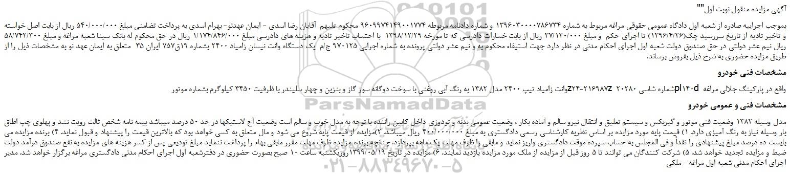 بموجب اجراییه صادره از شعبه اول دادگاه عمومی حقوقی مراغه مربوط به شماره 1396030000786734 و شماره دادنامه مربوطه 9609974149001774 محکوم علیهم آقایان رضا اسدی - ایمان عهدنو- بهرام اسدی به پرداخت تضامنی مبلغ 540/000/000 ریال از بابت اصل خواسته و تاخیر تادیه از تاریخ سررسید چک(1396/4/26) تا اجرای حکم و مبلغ 37/120/000 ریال از بابت خسارات دادرسی که تا مورخه 1398/12/29 با احتساب تاخیر تادیه و هزینه های دادرسی مبلغ 1/174/846/000 ریال در حق محکوم له بانک سینا شعبه مراغه و مبلغ 58/742/300 ریال نیم عشر دولتی در حق صندوق دولت شعبه اول اجرای احکام مدنی در نظر دارد جهت استیفاء محکوم به و نیم عشر دولتی پرونده به شماره اجرایی 970125 ج/م یک دستگاه وانت نیسان زامیاد 2400 بشماره 19ق757 ایران 35 متعلق به ایمان عهد نو به مشخصات ذیل را از طریق مزایده حضوری به شرح ذیل بفروش برساند.
