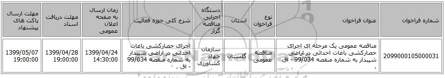 مناقصه، مناقصه عمومی یک مرحله ای اجرای حصارکشی باغات احداثی در اراضی شیبدار به شماره منقصه 99/034 - اق . , مناقصه عمومی یک مرحله ای اجرای حصارکشی باغات احداثی در اراضی شیبدار به شماره منقصه 99/034 - اق .