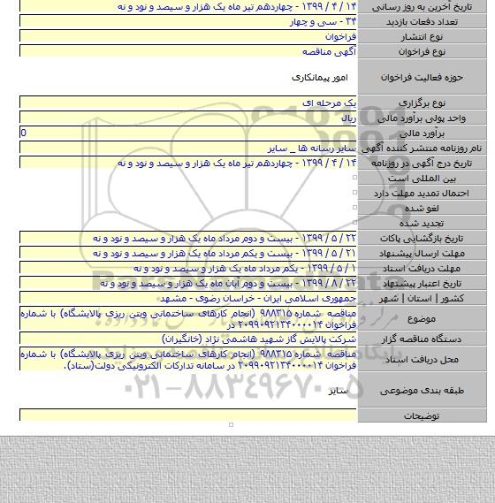 مناقصه شماره ۹۸۸۳۱۵ (انجام کارهای ساختمانی وبتن ریزی پالایشگاه) با شماره فراخوان ۲۰۹۹۰۹۲۱۳۴۰۰۰۰۱۴ در سامانه تدارکات الکترونیکی دولت(ستاد).