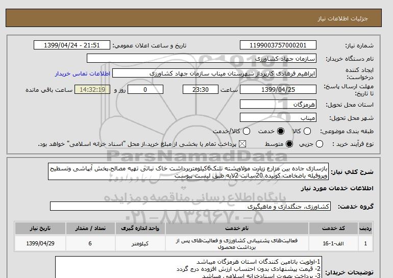 شرح کلی نیاز: بازسازی جاده بین مزارع زیارت مولاوپشته تلنک6کیلومتربرداشت خاک نباتی تهیه مصالح،پخش آبپاشی وتسطیح وپروفیله باضخامت کوبیده 20سانت 2لایه طبق لیست پیوست