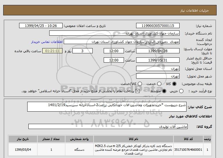 توضیحات خریدارشرح درپیوست *خریدتجهیزات وماشین الات خوداتکایی زراعت2-اسنادخزانه سررسید1401/2/19