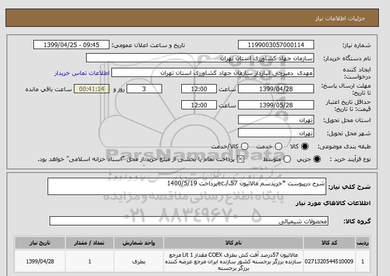 شرح کلی نیاز: شرح درپیوست *خریدسم مالاتیون 57./.ecپرداخت 1400/5/19