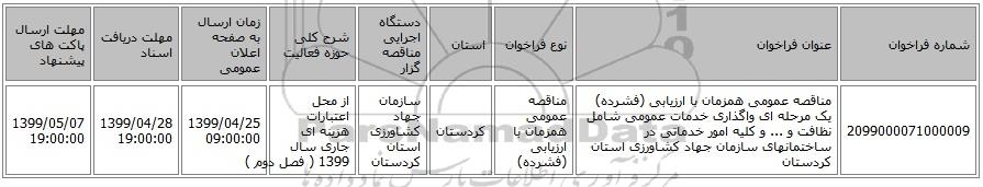 | 2099000071000009 | مناقصه عمومی همزمان با ارزیابی (فشرده) یک مرحله ای واگذاری خدمات عمومی شامل نظافت و ... و کلیه امور خدماتی در ساختمانهای سازمان جهاد کشاورزی استان کردستان | مناقصه عمومی همزمان با ارزیابی (فشرده) | کردستان | سازمان جهاد کشاورزی استان کردستان | از محل اعتبارات هزینه ای جاری سال 1399 ( فصل دوم ) | 1399/04/25 09:00:00 | 1399/04/28 19:00:00 | 1399/05/07 19:00:00 |