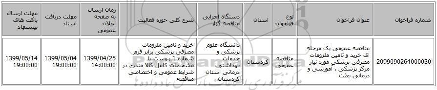 | 2099090264000030 | مناقصه عمومی یک مرحله ای خرید و تامین ملزومات مصرفی پزشکی مورد نیاز مرکز پزشکی ، آموزشی و درمانی بعثت | مناقصه عمومی | کردستان | دانشگاه علوم پزشکی و خدمات بهداشتی، درمانی استان کردستان | خرید و تامین ملزومات مصرفی پزشکی برابر فرم شماره 1 پیوست با مشخصات کامل کالا مندرج در شرایط عمومی و اختصاصی مناقصه | 1399/04/25 14:00:00 | 1399/05/04 19:00:00 | 1399/05/14 19:00:00 |