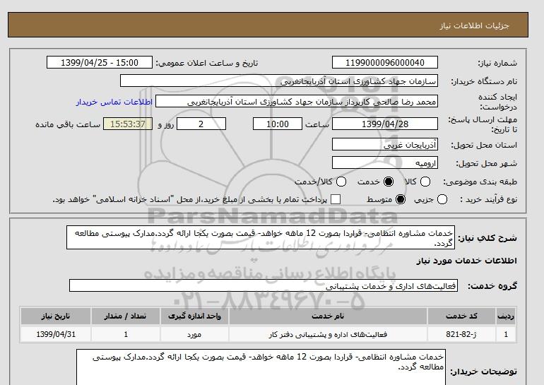 توضیحات خریدارخدمات مشاوره انتظامی- قراردا بصورت 12 ماهه خواهد- قیمت بصورت یکجا ارائه گردد.مدارک پیوستی مطالعه گردد.