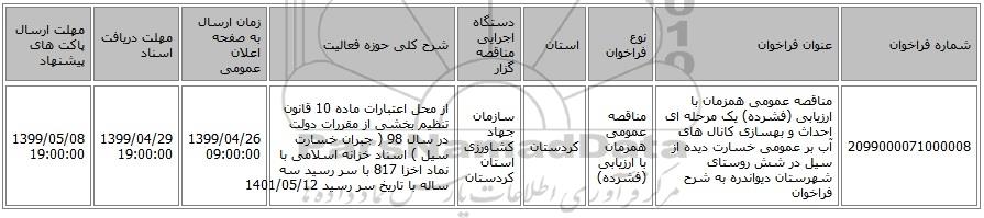 | 2099000071000008 | مناقصه عمومی همزمان با ارزیابی (فشرده) یک مرحله ای احداث و بهسازی کانال های آب بر عمومی خسارت دیده از سیل در شش روستای شهرستان دیواندره به شرح فراخوان | مناقصه عمومی همزمان با ارزیابی (فشرده) | کردستان | سازمان جهاد کشاورزی استان کردستان | از محل اعتبارات ماده 10 قانون تنظیم بخشی از مقررات دولت در سال 98 ( جبران خسارت سیل ) اسناد خزانه اسلامی با نماد اخزا 817 با سر رسید سه ساله با تاریخ سر رسید 1401/05/12 | 1399/04/26 09:00:00 | 1399/04/29 19:00:00 | 1399/05/08 19:00:00 |