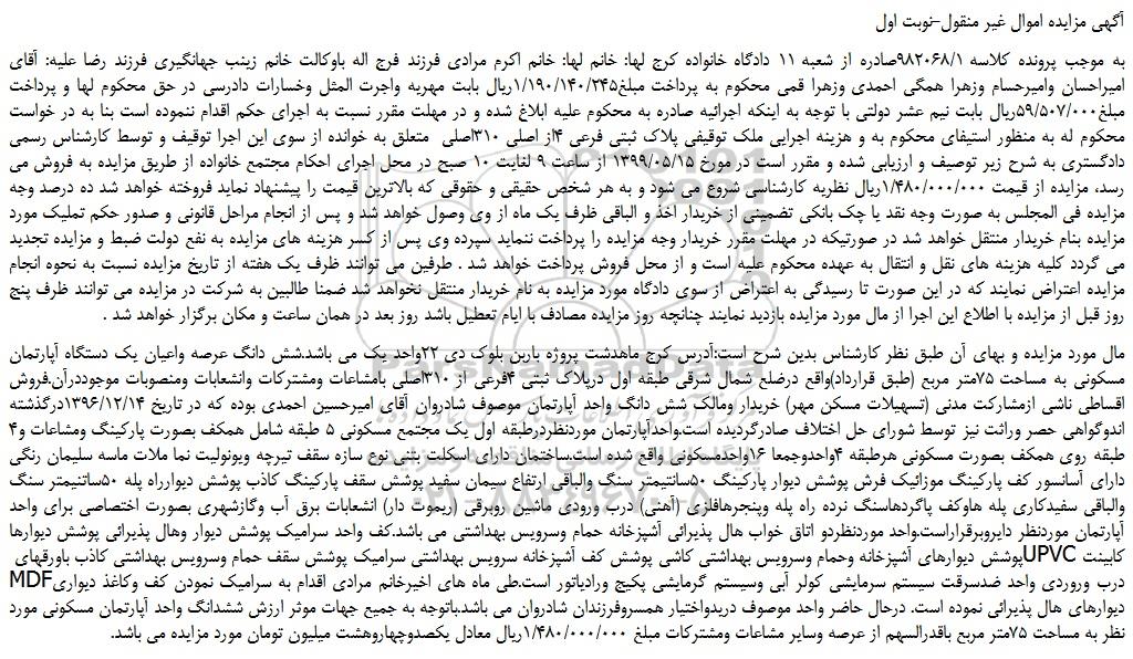 به موجب پرونده کلاسه 982068/1صادره از شعبه 11 دادگاه خانواده کرج لها: خانم لها: خانم اکرم مرادی فرزند فرج اله باوکالت خانم زینب جهانگیری فرزند رضا علیه: آقای امیراحسان وامیرحسام وزهرا همگی احمدی وزهرا قمی محکوم به پرداخت مبلغ1/190/140/245ریال بابت مهریه واجرت المثل وخسارات دادرسی در حق محکوم لها و پرداخت مبلغ59/507/000ریال بابت نیم عشر دولتی با توجه به اینکه اجرائیه صادره به محکوم علیه ابلاغ شده و در مهلت مقرر نسبت به اجرای حکم اقدام ننموده است بنا به در خواست محکوم له به منظور استیفای محکوم به و هزینه اجرایی ملک توقیفی پلاک ثبتی فرعی 4از اصلی 310اصلی متعلق به خوانده از سوی این اجرا توقیف و توسط کارشناس رسمی دادگستری به شرح زیر توصیف و ارزیابی شده و مقرر است در مورخ 1399/05/15 از ساعت 9 لغایت 10 صبح در محل اجرای احکام مجتمع خانواده از طریق مزایده به فروش می رسد، مزایده از قیمت 1/480/000/000ریال نظریه کارشناسی شروع می شود و به هر شخص حقیقی و حقوقی که بالاترین قیمت را پیشنهاد نماید فروخته خواهد شد ده درصد وجه مزایده فی المجلس به صورت وجه نقد یا چک بانکی تضمینی از خریدار اخذ و الباقی ظرف یک ماه از وی وصول خواهد شد و پس از انجام مراحل قانونی و صدور حکم تملیک مورد مزایده بنام خریدار منتقل خواهد شد در صورتیکه در مهلت مقرر خریدار وجه مزایده را پرداخت ننماید سپرده وی پس از کسر هزینه های مزایده به نفع دولت ضبط و مزایده تجدید می گردد کلیه هزینه های نقل و انتقال به عهده محکوم علیه است و از محل فروش پرداخت خواهد شد . طرفین می توانند ظرف یک هفته از تاریخ مزایده نسبت به نحوه انجام مزایده اعتراض نمایند که در این صورت تا رسیدگی به اعتراض از سوی دادگاه مورد مزایده به نام خریدار منتقل نخواهد شد ضمنا طالبین به شرکت در مزایده می توانند ظرف پنج روز قبل از مزایده با اطلاع این اجرا از مال مورد مزایده بازدید نمایند چنانچه روز مزایده مصادف با ایام تعطیل باشد روز بعد در همان ساعت و مکان برگزار خواهد شد .