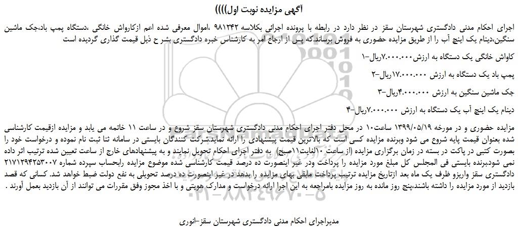 اجرای احکام مدنی دادگستری شهرستان سقز در نظر دارد در رابطه با پرونده اجرائی بکلاسه 981242 ،اموال معرفی شده اعم ازکارواش خانگی ،دستگاه پمپ باد،جک ماشین سنگین،دینام یک اینچ آب را از طریق مزایده حضوری به فروش برساند.که پس از ارجاع امر به کارشناس خبره دادگستری بشر ح ذیل قیمت گذاری گردیده است
