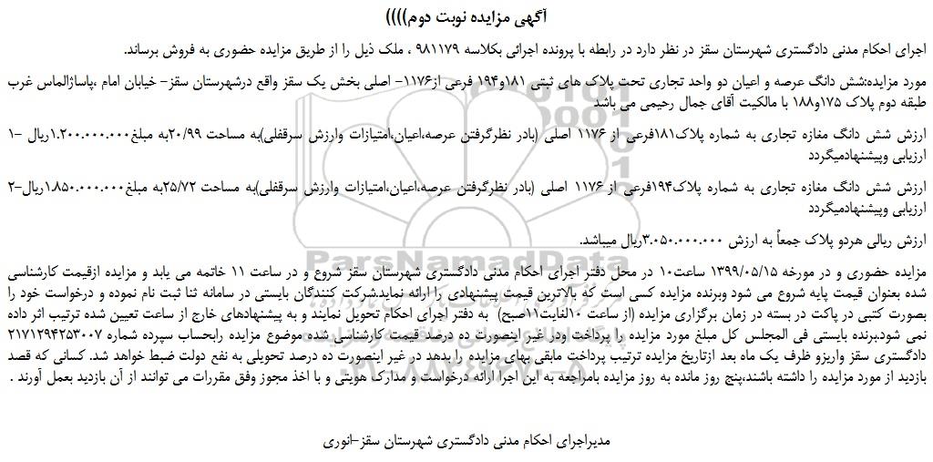 مزایده فروش شش دانگ عرصه و اعیان دو واحد تجاری تحت پلاک های ثبتی 181و194 فرعی از1176- اصلی - نوبت دوم, مزایده، مزایده فروش شش دانگ عرصه و اعیان دو واحد تجاری تحت پلاک های ثبتی 181و194 فرعی از1176- اصلی - نوبت دوم