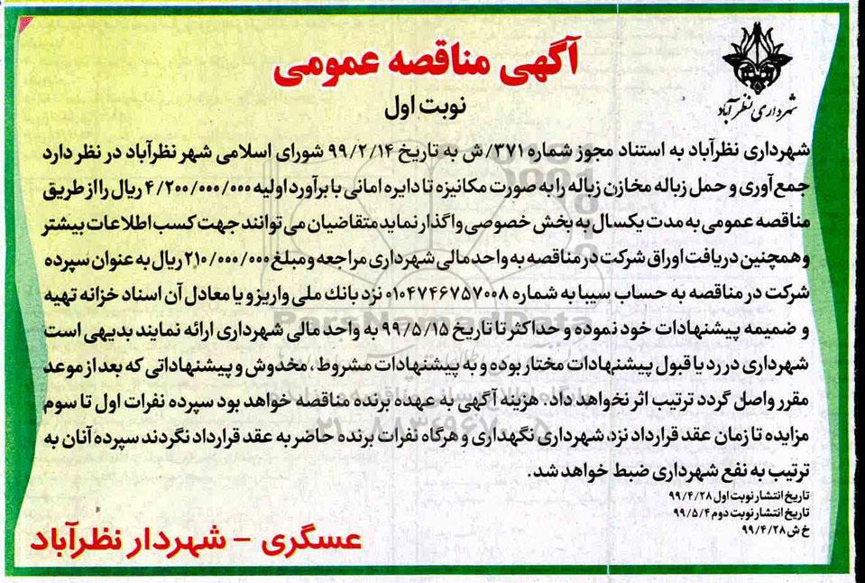 شهرداری نظرآباد به استناد مجوز شماره 371 / ش به تاریخ 99.2.14 شورای اسلامی شهر نظرآباد در نظر دارد جمع آوری و حمل زباله مخازن زباله را به صورت مکانیزه تا دایره امانی با برآورد اولیه 4.200.000.000 ریال را از طریق مناقصه عمومی به مدت یک سال به شخص خصوصی واگذار نماید.  متقاضیان می توانند جهت کسب اطلاعات بیشتر و همچنین اوراق شرکت در مناقصه به واحد مالی شهرداری مراجعه و مبلغ 210.000.000 ریال به عنوان سپرده شرکت در مناقصه به حساب سیبا به شماره 0104746757008 نزد بانک ملی واریز و یا معادل آن اسناد خزانه تهیه و ضمیمه پیشنهادات خود نموده و حداکثر تا تاریخ 99.5.15 به واحد مالی شهرداری ارائه نمایند