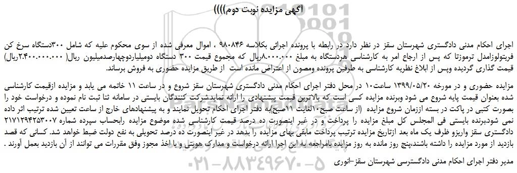 اجرای احکام مدنی دادگستری شهرستان سقز در نظر دارد در رابطه با پرونده اجرائی بکلاسه 980846 ، اموال معرفی شده از سوی محکوم علیه که شامل 300دستگاه سرخ کن فریتولوزامدل ترموزتا که پس از ارجاع امر به کارشناسی هردستگاه به مبلغ 8.000.000ریال که مجموع قیمت 300 دستگاه دومیلیاردوچهارصدمیلیون ریال( 2.400.000.000ریال) قیمت گذاری گردیده وپس از ابلاغ نظریه کارشناسی به طرفین پرونده ومصون از اعتراض مانده است  از طریق مزایده حضوری به فروش برساند.