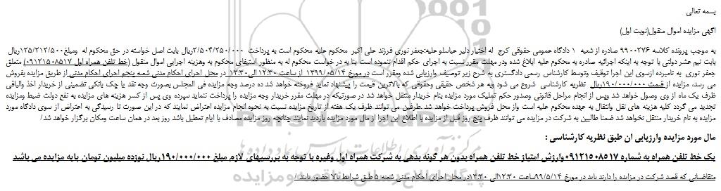 به موجب پرونده کلاسه 9900276 صادره از شعبه  1 دادگاه عمومی حقوقی کرج  له اختیار دلیر عباسلو علیه:جعفر نوری فرزند علی اکبر  محکوم علیه محکوم است به پرداخت  2/504/250/000ریال بابت اصل خواسته در حق محکوم له  ومبلغ125/212/500ریال  بابت نیم عشر دولتی با توجه به اینکه اجرائیه صادره به محکوم علیه ابلاغ شده ودر مهلت مقرر نسبت به اجرای حکم اقدام ننموده است بنا به در خواست محکوم له به منظور استیفای محکوم به وهزینه اجرایی اموال منقول (خط تلفن همراه اول 09121508517) متعلق جعفر نوری  به نامبرده ازسوی این اجرا توقیف وتوسط کارشناس رسمی دادگستری به شرح زیر توصیف وارزیابی شده ومقرر است در مورخ 1399/05/14  از ساعت 12:30 الی13:30  در محل اجرای احکام مدنی شعبه پنجم اجرای احکام مدنی از طریق مزایده بفروش می رسد، مزایده از قیمت 190/000/000ریال  نظریه کارشناسی  شروع می شود وبه هر شخص حقیقی وحقوقی که بالاترین قیمت را پیشنهاد نماید فروخته خواهد شد ده درصد وجه مزایده فی المجلس بصورت وجه نقد یا چک بانکی تضمینی از خریدار اخذ والباقی ظرف یک ماه از وی وصول خواهد شد وپس از انجام مراحل قانونی وصدور حکم تملیک مورد مزایده بنام خریدار منتقل خواهد شد در صورتیکه در مهلت مقرر خریدار وجه مزایده را پرداخت ننماید سپرده وی پس از کسر هزینه های مزایده به نفع دولت ضبط ومزایده تجدید می گردد کلیه هزینه های نقل وانتقال به عهده محکوم علیه است واز محل فروش پرداخت خواهد شد .طرفین می توانند ظرف یک هفته از تاریخ مزایده نسبت به نحوه انجام مزایده اعتراض نمایند که در این صورت تا رسیدگی به اعتراض از سوی دادگاه مورد مزایده به نام خریدار منتقل نخواهد شد ضمنا طالبین به شرکت در مزایده می توانند ظرف پنج روز قبل از مزایده با اطلاع این اجرا از مال مورد مزایده بازدید نمایند چنانچه روز مزایده مصادف با ایام تعطیل باشد روز بعد در همان ساعت ومکان برگزار خواهد شد/