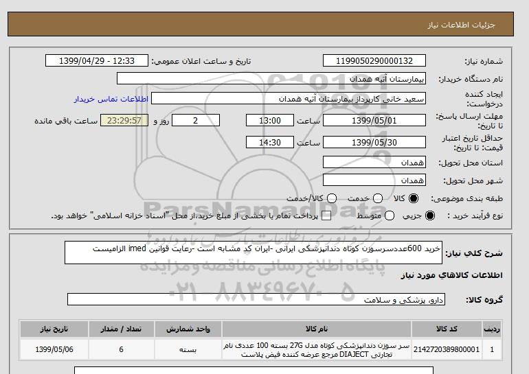 شرح کلی نیاز: خرید 600عددسرسوزن کوتاه دندانپزشکی ایرانی -ایران کد مشابه است -رعایت قوانین imed الزامیست