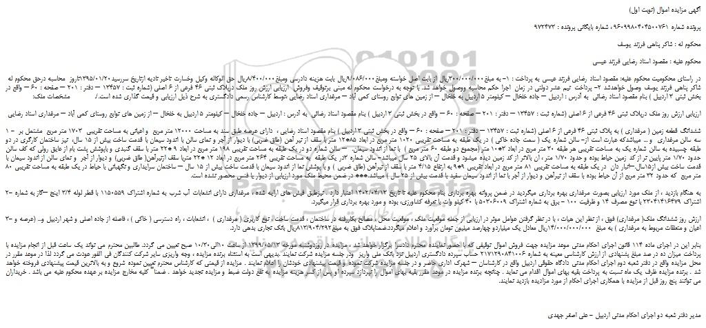 در راستای محکومیت محکوم علیه: مقصود استاد رضایی فرزند عیسی به پرداخت : 1- به مبلغ300/000/000ریال از بابت اصل خواسته ومبلغ9/086/000ریال بابت هزینه دادرسی ومبلغ8/400/000ریال حق الوکاله وکیل وخسارت تاخیر تادیه ازتاریخ سررسید1395/01/20تاروز محاسبه درحق محکوم له شاکر پناهی فرزند یوسف وصول خواهدشد 2- پرداخت نیم عشر دولتی در زمان اجرا حکم محاسبه ووصول خواهد شد. با توجه به درخواست محکوم له مبنی برتوقیف وفروش ارزیابی ارزش روز ملک درپلاک ثبتی 46 فرعی از 6 اصلی (شماره ثبت : 13457 – دفتر : 201 – صفحه : 60 – واقع در بخش ثبتی 3 اردبیل ) بنام مقصود استاد رضائی به آدرس : اردبیل – جاده خلخال – کیلومتر 5 اردبیل به خلخال – از زمین های توابع روستای کمی آباد – مرغداری استاد رضایی ،توسط کارشناس رسمی دادگستری به شرح ذیل ارزیابی و قیمت گذاری شده است./. مشخصات ملک: