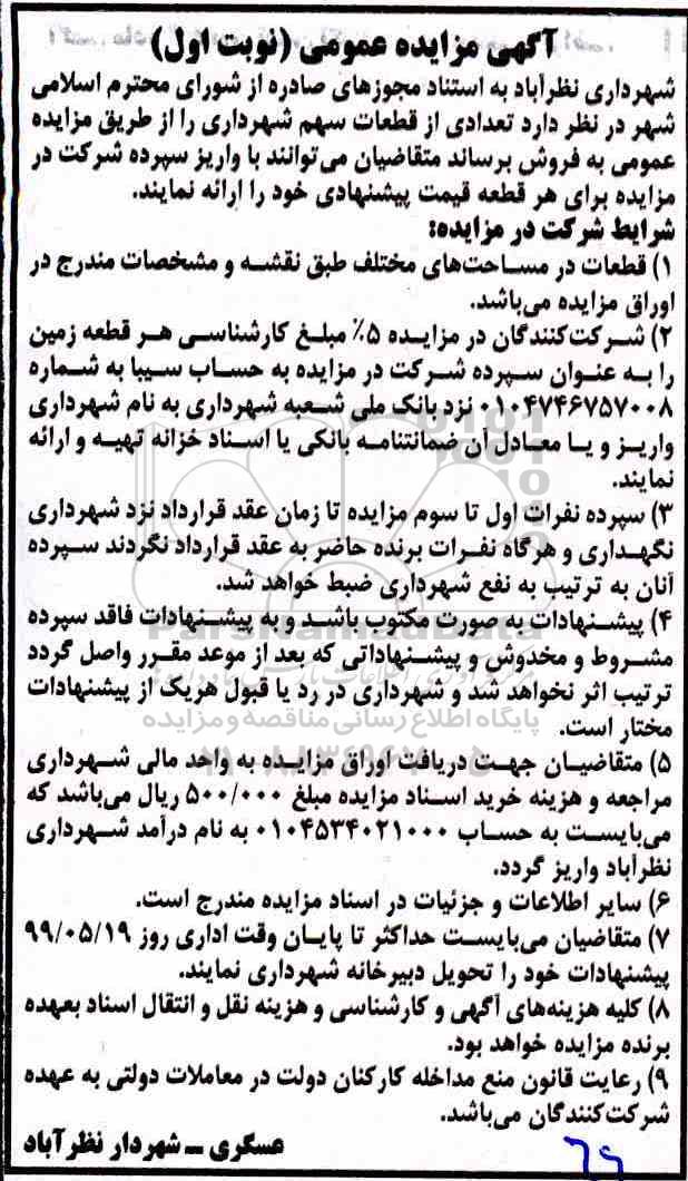 مزایده فروش تعدادی از قطعات سهم شهرداری نوبت اول