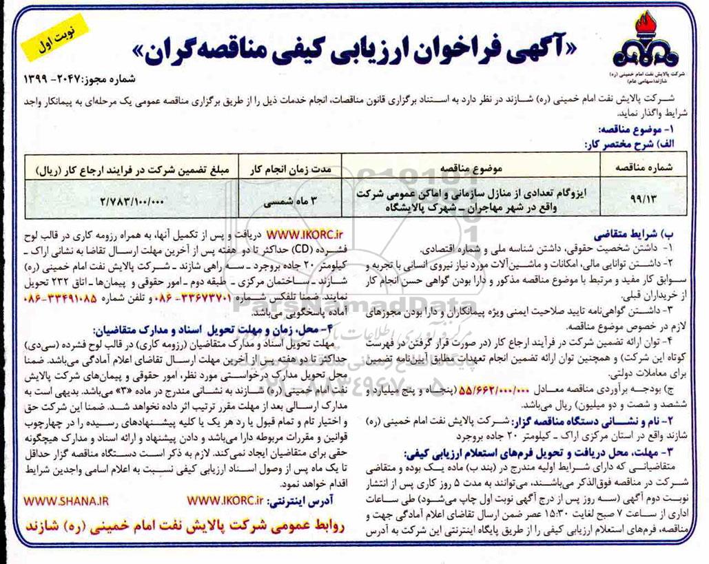 99/13 ایزوگام تعدادی از منازل سازمانی و اماکن عمومی شرکت واقع در شهر مهاجران- شهرک پالایشگاه