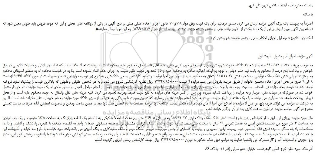 احتراماً به پیوست یک برگ آگهی مزایده ارسال می گردد دستور فرمائید برای یک نوبت وفق مواد 118و119 قانون اجرای احکام مدنی مبنی بر درج آگهی در یکی از روزنامه های محلی و این که موعد فروش باید طوری معین شود که فاصله بین آگهی وروز فروش بیش از یک ماه وکمتر از 10روز نباشد چاپ و منتشر نتیجه جهت درج در پرونده قبل از تاریخ 1399/05/27 به این اجرا ارسال نمایند.*