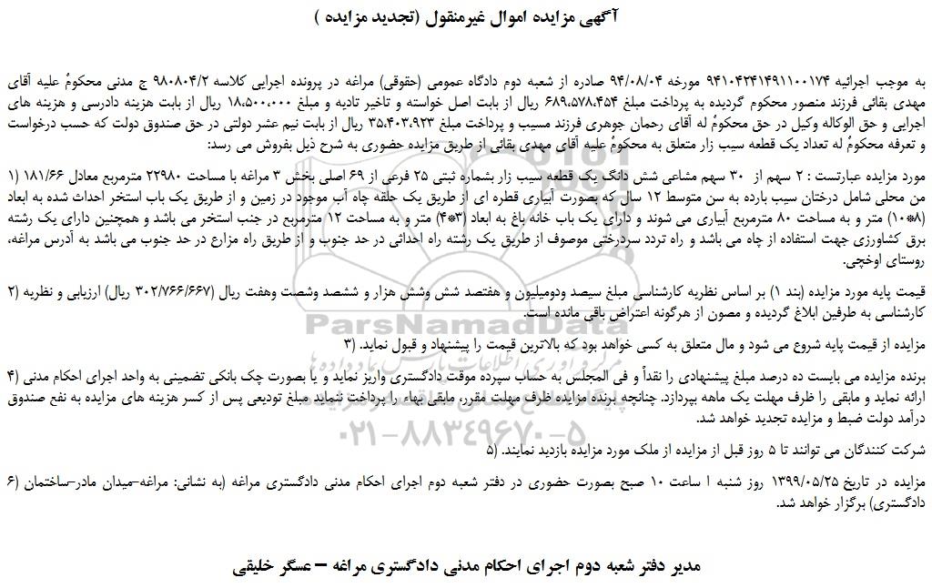 به موجب اجرائیه 94104241491100174 مورخه 94/08/04 صادره از شعبه دوم دادگاه عمومی (حقوقی) مراغه در پرونده اجرایی کلاسه 980804/2 ج مدنی محکومٌ علیه آقای مهدی بقائی فرزند منصور محکوم گردیده به پرداخت مبلغ 689،578،454 ریال از بابت اصل خواسته و تاخیر تادیه و مبلغ 18،500،000 ریال از بابت هزینه دادرسی و هزینه های اجرایی و حق الوکاله وکیل در حق محکومٌ له آقای رحمان جوهری فرزند مسیب و پرداخت مبلغ 35،403،923 ریال از بابت نیم عشر دولتی در حق صندوق دولت که حسب درخواست و تعرفه محکومٌ له تعداد یک قطعه سیب زار متعلق به محکومٌ علیه آقای مهدی بقائی از طریق مزایده حضوری به شرح ذیل بفروش می رسد: