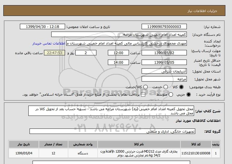 شرح کلی نیاز: محل تحویل کمیته امداد امام خمینی (ره) شهرستان مراغه می باشد - تسویه حساب بعد از تحویل کالا در محل می باشد