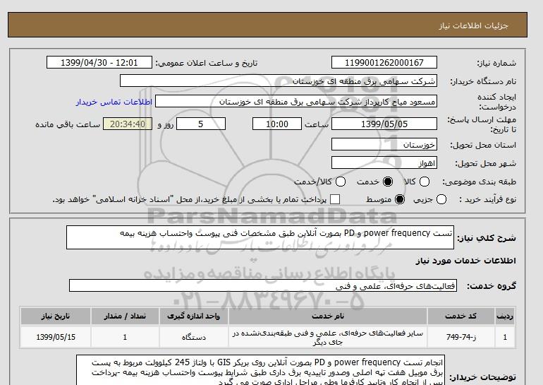 شرح کلی نیاز: تست power frequency و PD بصورت آنلاین طبق مشخصات فنی پیوست واحتساب هزینه بیمه