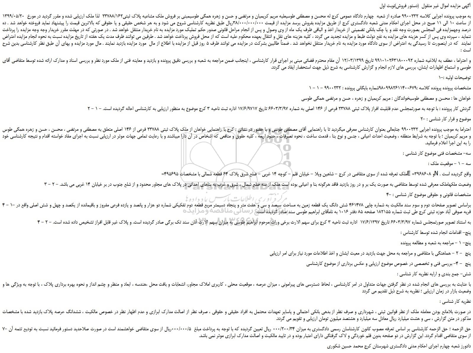 به موجب پرونده اجرایی کلاسه 9900232 صادره از شعبه  چهارم دادگاه عمومی کرج له محسن و مصطفی طوسیعلیه مریم کریمیان و مرتضی و حسن و زهره همگی طوسیمبنی بر فروش ملک مشاعیه پلاک ثبتی23788/162  لذا ملک ارزیابی شده و مقرر گردید در مورخ  1399/05/20 از ساعت 10 الی 11 صبح در محل اجرای احکام مدنی شعبه دادگستری کرج از طریق مزایده بفروش برسد مزایده از قیمت 38/000/000/000ریال طبق نظریه کارشناسی شروع می شود و به هر شخص حقیقی و یا حقوقی که بالاترین قیمت را پیشنهاد نماید فروخته خواهد شد . ده درصد وجهمزایده فی المجلس بصورت وجه نقد و یا چک بانکی تضمینی از خریدار اخذ و الباقی ظرف یک ماه از وی وصول و پس از انجام مراحل قانونی صدور حکم تملیک مورد مزایده به نام خریدار منتقل خواهد شد . در صورتی که در مهلت مقرر خریدار وجه وجه مزایده را پرداخت ننماید ، سپرده وی پس از کسر هزینه های مزایده به نفع دولت ظبط و مزایده تجدید می گردد ، کلیه هزینه های نقل و انتقال بعهده محکوم علیه است که از محل فروش پرداخت خواهد شد . طرفین می توانند ظرف مدت یک هفته از تاریخ مزایده نسبت به نحوه انجام مزایده اعتراض نمایند  که در اینصورت تا رسیدگی به اعتراض از سوی دادگاه مورد مزایده به نام خریدار منتقل نخواهد شد . ضمناً طالبین بشرکت در مزایده می توانند ظرف 5 روز قبل از مزایده با اطلاع از مال  مورد مزایده بازدید نمایند . مال مورد مزایده و بهای آن طبق نظر کارشناسی بدین شرح است :