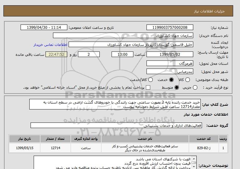شرح کلی نیاز: خرید خدمت راننده پایه 2 بصورت ساعتی جهت رانندگی با خودروهای گشت اراضی در سطح استان به مقدار12714 ساعت طبق شرایط دعوتنامه پیوست
