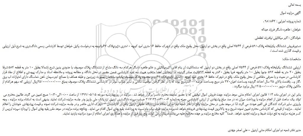 مزایده فروش ششدانگ یکبابخانه پلاک591 فرعی از 7544 اصلی , مزایده، مزایده فروش ششدانگ یکبابخانه پلاک591 فرعی از 7544 اصلی