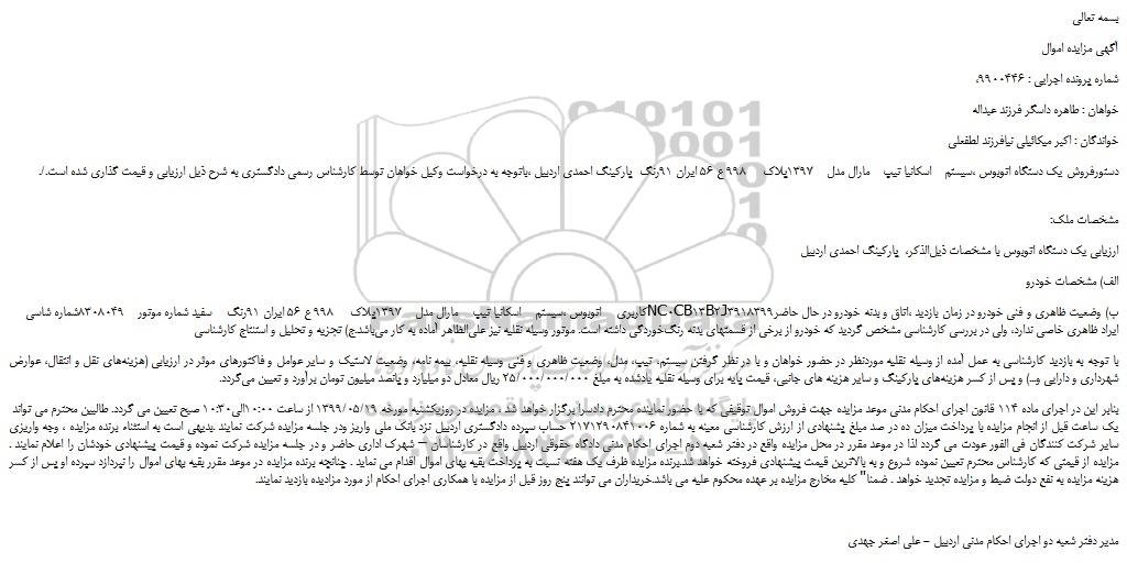 دستورفروش یک دستگاه اتوبوس ،سیستم    اسکانیا تیپ    مارال مدل    1397پلاک     998 ع 56 ایران 91رنگ  پارکینگ احمدی اردبیل ،باتوجه به درخواست وکیل خواهان توسط کارشناس رسمی دادگستری به شرح ذیل ارزیابی و قیمت گذاری شده است./.