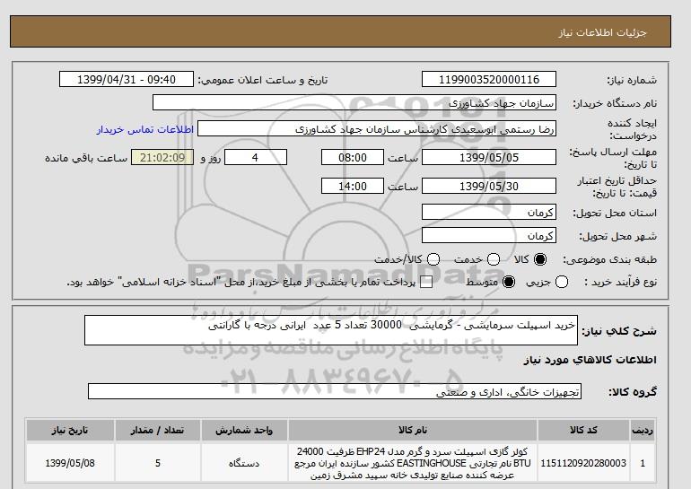 شرح کلی نیاز: خرید اسپیلت سرمایشی - گرمایشی 30000 تعداد 5 عدد ایرانی درجه با گارانتی