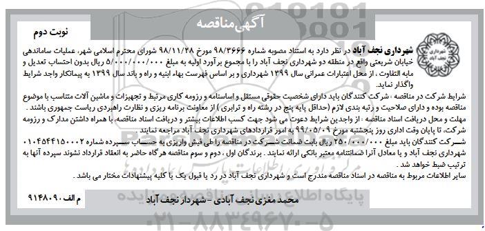 شهرداری نجف آباد در نظر دارد به استناد مصوبه شماره 99/895 مورخ 99.4.1 شورای محترم اسلامی شهر، عملیات ساماندهی خیابان شریعتی واقع در منطقه دو شهرداری نجف آباد را با مجموع برآورد اولیه به مبلغ 5.000.000.000 ریال بدون احتساب تعدیل و مابه التفاوت از محل اعتبارات عمرانی سال 1399 شهرداری و بر اساس فهرست بها ابنیه و راه و باند سال 1399 به پیمانکار واجد شرایط واگذار نماید.