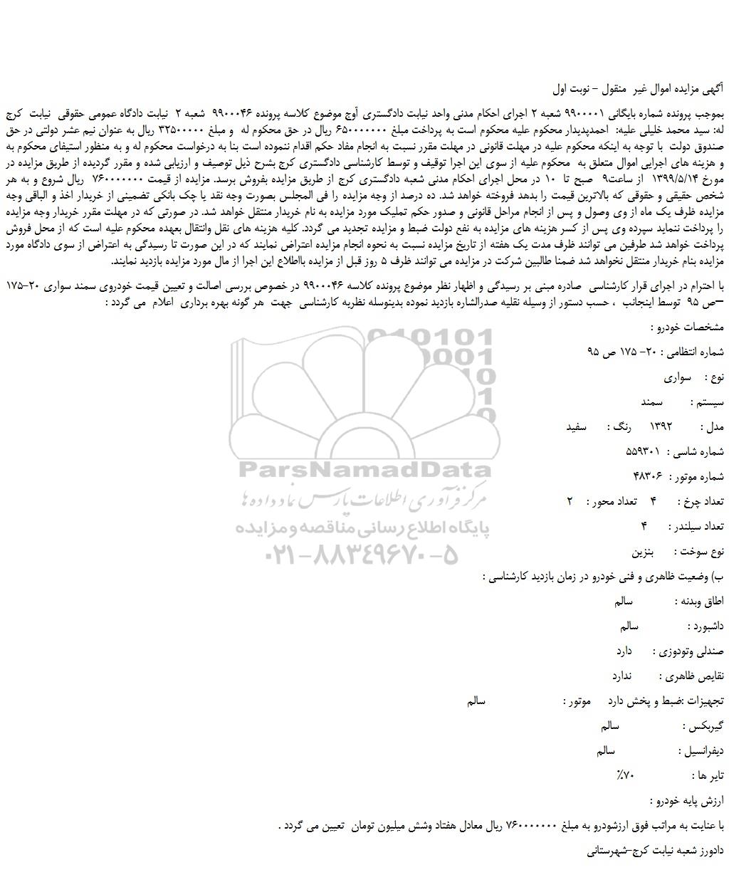 با احترام در اجرای قرار کارشناسی  صادره مبنی بر رسیدگی و اظهار نظر موضوع پرونده کلاسه 9900046 در خصوص بررسی اصالت و تعیین قیمت خودروی سمند سواری 20-175 –ص 95  توسط اینجانب  ، حسب دستور از وسیله نقلیه صدرالشاره بازدید نموده بدینوسله نظریه کارشناسی  جهت  هر گونه بهره برداری  اعلام  می گردد :