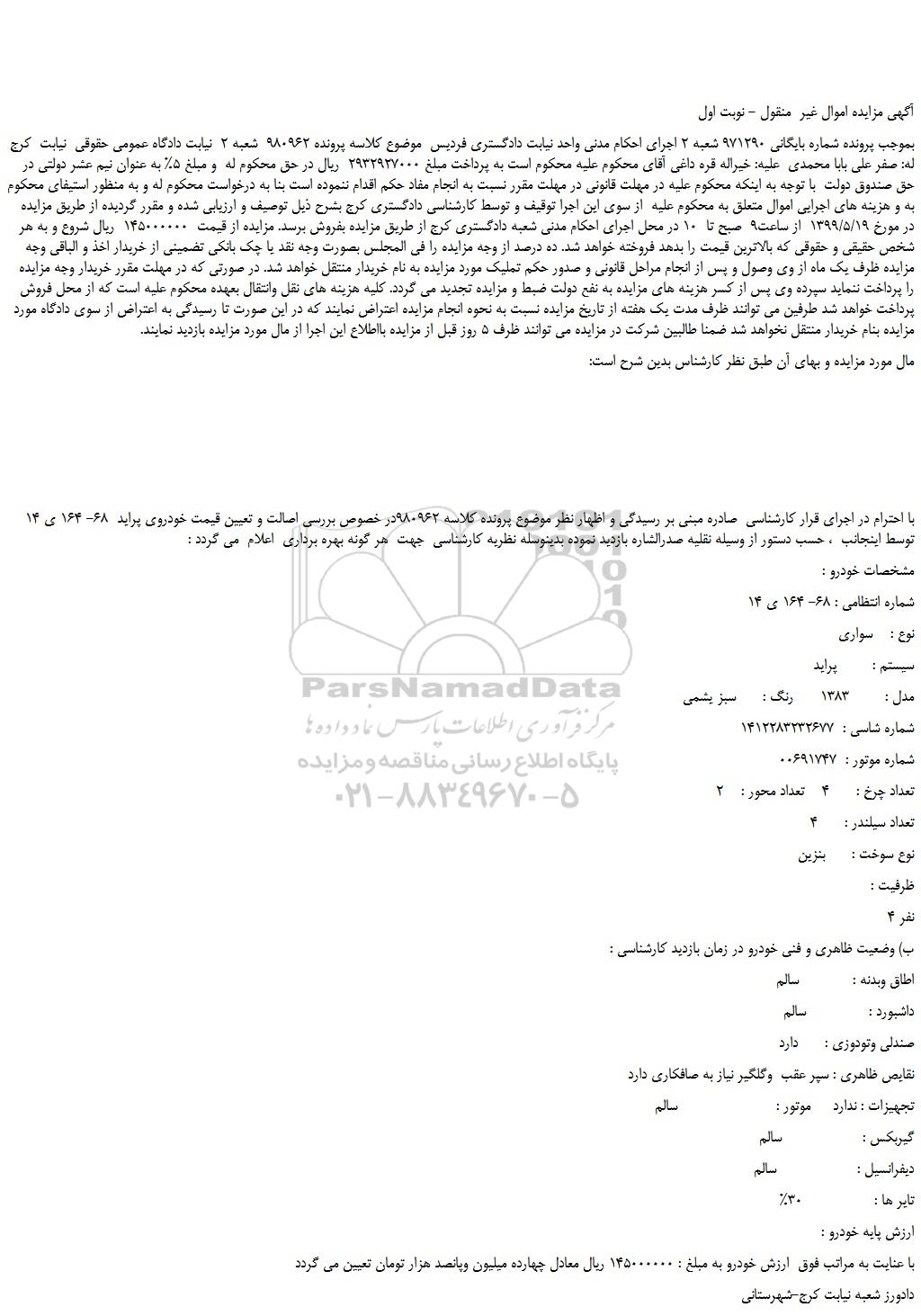 بموجب پرونده شماره بایگانی 971290 شعبه 2 اجرای احکام مدنی واحد نیابت دادگستری فردیس  موضوع کلاسه پرونده 980962  شعبه 2  نیابت دادگاه عمومی حقوقی  نیابت  کرج له: صفر علی بابا محمدی  علیه: خیراله قره داغی آقای محکوم علیه محکوم است به پرداخت مبلغ 2932927000  ریال در حق محکوم له  و مبلغ 5% به عنوان نیم عشر دولتی در حق صندوق دولت  با توجه به اینکه محکوم علیه در مهلت قانونی در مهلت مقرر نسبت به انجام مفاد حکم اقدام ننموده است بنا به درخواست محکوم له و به منظور استیفای محکوم به و هزینه های اجرایی اموال متعلق به محکوم علیه  از سوی این اجرا توقیف و توسط کارشناسی دادگستری کرج بشرح ذیل توصیف و ارزیابی شده و مقرر گردیده از طریق مزایده در مورخ 1399/5/19  از ساعت9  صبح تا  10 در محل اجرای احکام مدنی شعبه دادگستری کرج از طریق مزایده بفروش برسد. مزایده از قیمت  145000000  ریال شروع و به هر شخص حقیقی و حقوقی که بالاترین قیمت را بدهد فروخته خواهد شد. ده درصد از وجه مزایده را فی المجلس بصورت وجه نقد یا چک بانکی تضمینی از خریدار اخذ و الباقی وجه مزایده ظرف یک ماه از وی وصول و پس از انجام مراحل قانونی و صدور حکم تملیک مورد مزایده به نام خریدار منتقل خواهد شد. در صورتی که در مهلت مقرر خریدار وجه مزایده را پرداخت ننماید سپرده وی پس از کسر هزینه های مزایده به نفع دولت ضبط و مزایده تجدید می گردد. کلیه هزینه های نقل وانتقال بعهده محکوم علیه است که از محل فروش پرداخت خواهد شد طرفین می توانند ظرف مدت یک هفته از تاریخ مزایده نسبت به نحوه انجام مزایده اعتراض نمایند که در این صورت تا رسیدگی به اعتراض از سوی دادگاه مورد مزایده بنام خریدار منتقل نخواهد شد ضمنا طالبین شرکت در مزایده می توانند ظرف 5 روز قبل از مزایده بااطلاع این اجرا از مال مورد مزایده بازدید نمایند.