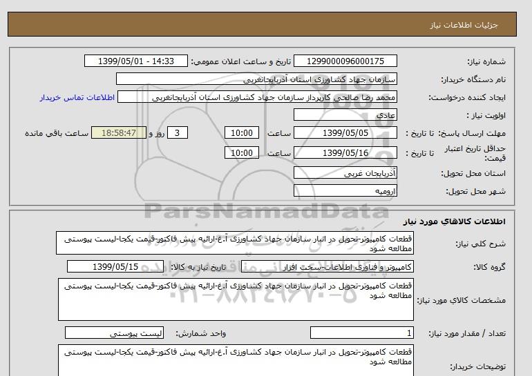 شرح کلی نیاز: قطعات کامپیوتر-تحویل در انبار سازمان جهاد کشاورزی آ.غ-ارائیه پیش فاکتور-قیمت یکجا-لیست پیوستی مطالعه شود