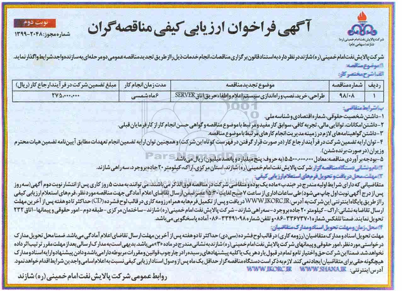 3. مهلت، محل دریافت و تحویل فرمهای استعلام ارزیابی کیفی: متقاضیانی که دارای شرایط اولیه مندرج در بند ب ماده یک بوده و متقاضی شرکت در مناقصه فوق الذکر می باشند می توانند به مدت 5 روز کاری پس از انتشار نوبت دوم آ گهی (سه روز پس از درج آگهی نوبت اول چاپ می شود) طی ساعات اداری از ساعت 7 صبح لغایت 15:30 عصر ضمن ارسال تقاضای اعلام آمادگی، فرم های استعلام ارزیابی کیفی را از طریق پایگاه اینترنتی این شرکت به آدرس WWW.IKORC.IR دریافت و پس از تکمیل فرم ها به همراه رزومه کاری در قالب لوح فشرده cd حداکثر تا دو هفته پس از آخرین مهلت تقاضا به نشانی: اراک، کیلومتر 20 جاده بروجرد، سه راهی شازند، شرکت پالایش نفت امام خمینی (ره) شازند، ساختمان مرکزی طبقه دوم، امور حقوقی و پیمان ها، اتاق 232 تحویل نمایند.