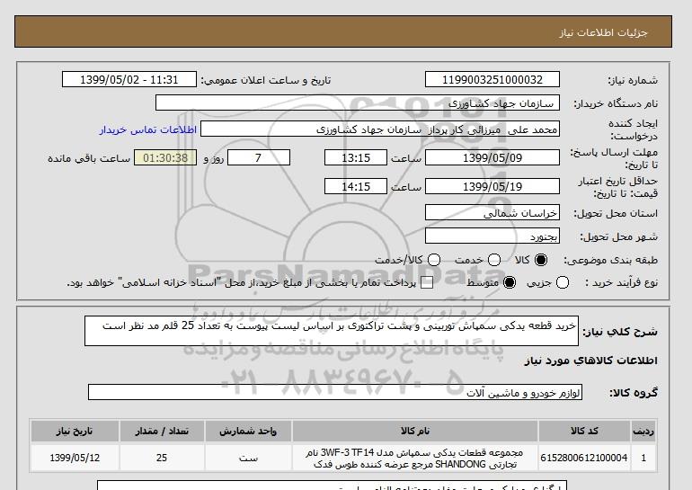 شرح کلی نیاز: خرید قطعه یدکی سمپاش توربینی و پشت تراکتوری بر اساس لیست پیوست به تعداد 25 قلم مد نظر است