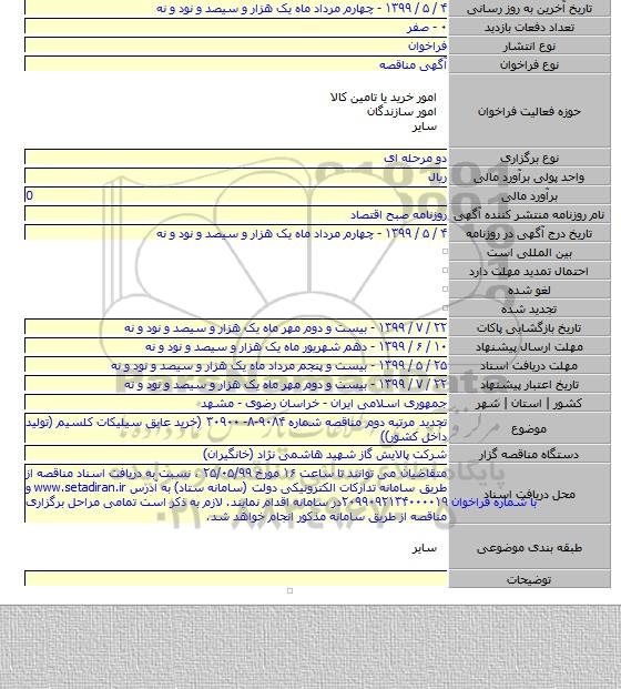 علاقهمندان میتوانند جهت دریافت اسناد و اطلاعات تکمیلی، مناقصه, تجدید مرتبه دوم مناقصه شماره ۹۰۸۴-۸- ۳۰۹۰۰ (خرید عایق سیلیکات کلسیم (تولید داخل کشور)) با سامانه مناقصات و مزایدات ایران پارسنماد داده ها 88349670 تماس حاصل نمایند.