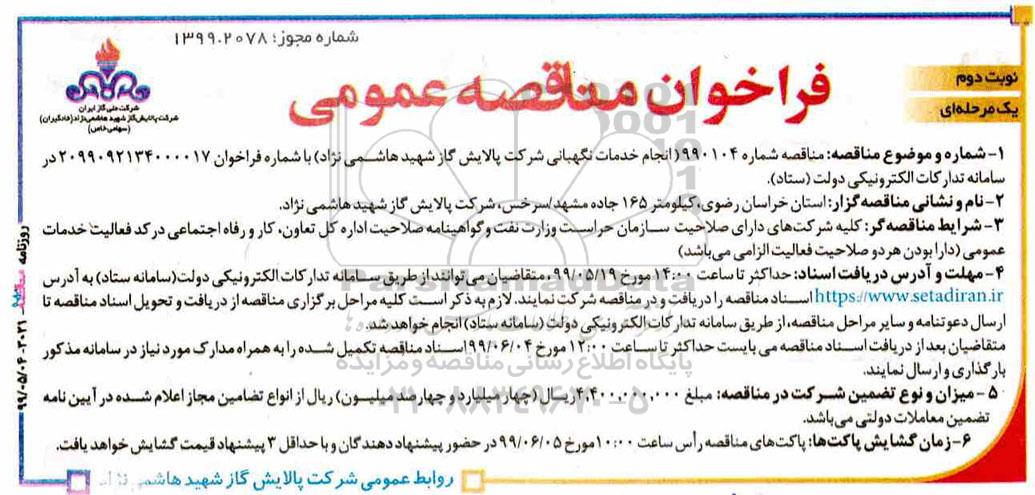 1- شماره و موضوع مناقصه: مناقصه شماره 990104 (انجام خدمات نگهبانی شرکت پالایش گاز شهید هاشمی نژاد) با شماره فراخوان 2099092134000017 در سامانه تدارکات الکترونیکی دولت (ستاد)