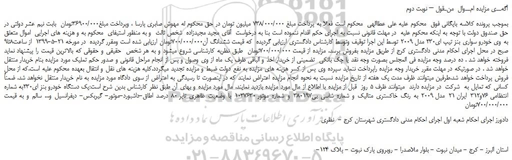 بموجب پرونده کلاسه بایگانی فوق محکوم علیه علی عطاالهی محکوم است فعلا به پرداخت مبلغ 738/000/000 میلیون تومان در حق محکوم له مهوش صابری پارسا ، وپرداخت مبلغ36900/000تومان بابت نیم عشر دولتی در حق صندوق دولت با توجه به اینکه محکوم علیه در مهلت قانونی نسبت به اجرای حکم اقدام ننموده است بنا به درخواست آقای مجید مجیدزاده شخص ثالث و به منظور استیفای محکوم به و هزینه های اجرایی اموال متعلق به وی خودرو سواری بنز تیپ ای230 مدل 2009 توسط این اجرا توقیف وتوسط کارشناس دادگستری ارزیابی گردیده که قیمت ششدانگ آن700/000/000تومان ارزیابی شده است ومقرر گردیده در مورخه 21-5-1399 از ساعت8تا9 صبح در محل اجرای احکام مدنی دادگستری کرج از طریق مزایده بفروش برسد. مزایده از قیمت 700/000/000تومان طبق نظریه کارشناسی شروع میشود و به هر شخص حقیقی و حقوقی که بالاترین قیمت را پیشنهاد نماید فروخته خواهد شد . ده درصد وجه مزایده فی المجلس بصورت وجه نقد یا چک بانکی تضمینی از خریدار اخذ و الباقی ظرف یک ماه از وی وصول و پس از انجام مراحل قانونی و صدور حکم تملیک مورد مزایده بنام خریدار منتقل خواهد شد . در صورتیکه در مهلت مقرر خریدار وجه مزایده راپرداخت ننماید سپرده وی پس از کسر هزینه های مزایده به نفع دولت ضبط و مزایده تجدید میگردد.کلیه هزینه های نقل و انتقال بعهده محکوم علیه است.که از محل فروش پرداخت خواهد شد.طرفین میتوانند ظرف مدت یک هفته از تاریخ مزایده نسبت به نحوه انجام مزایده اعتراض نمایند که در اینصورت تا رسیدگی به اعتراض از سوی دادگاه مورد مزایده به نام خریدار منتقل نخواهد شد. ضمناً کسانی که تمایل به شرکت در مزایده دارند میتوانند ظرف 5 روز قبل از مزایده با اطلاع از مال مورد مزایده بازدید نمایند. مال مورد مزایده و بهای آن طبق نظر کارشناس بدین شرح است:یک دستگاه خودرو بنز ای230به شماره انتظامی 76و312 ایران 21 مدل 2009 به رنگ خاکستری متالیک و شماره شاسی بی380197 و شماره موتور 1037630 با وضعیت ظاهری تایر 80 درصد اطاق-داشبورد-موتور- گیربکس- دیفرانسیل و... سالم و به قیمت 700/000/000تومان