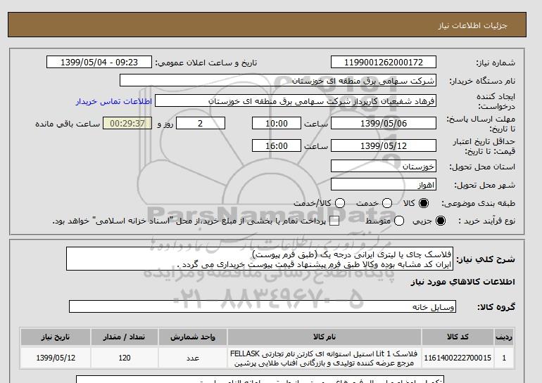 شرح کلی نیاز: فلاسک چای یا لیتری ایرانی درجه یک (طبق فرم پیوست) ایران کد مشابه بوده وکالا طبق فرم پیشنهاد قیمت پیوست خریداری می گردد .