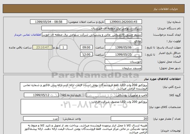 شرح کلی نیاز: پروژکتور 200 وات LED. فقط فروشندگان بومی استان قیمت ارائه کنند.ارائه پیش فاکتور و شماره تماس فروشنده الزامی میباشد.