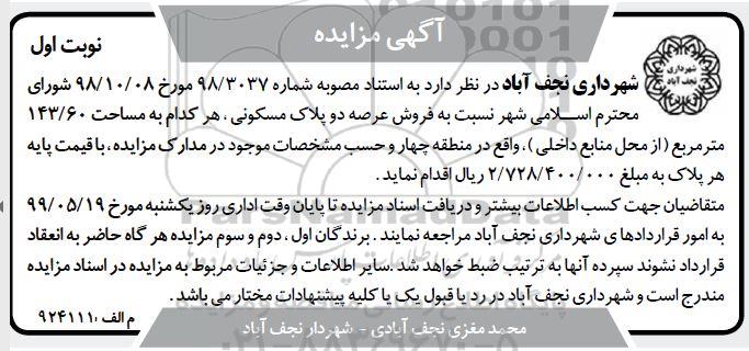 مزایده فروش عرصه دو پلاک مسکونی 143.60 مترمربع نوبت اول , آگهی مزایده مزایده فروش عرصه دو پلاک مسکونی 143.60 مترمربع نوبت اول