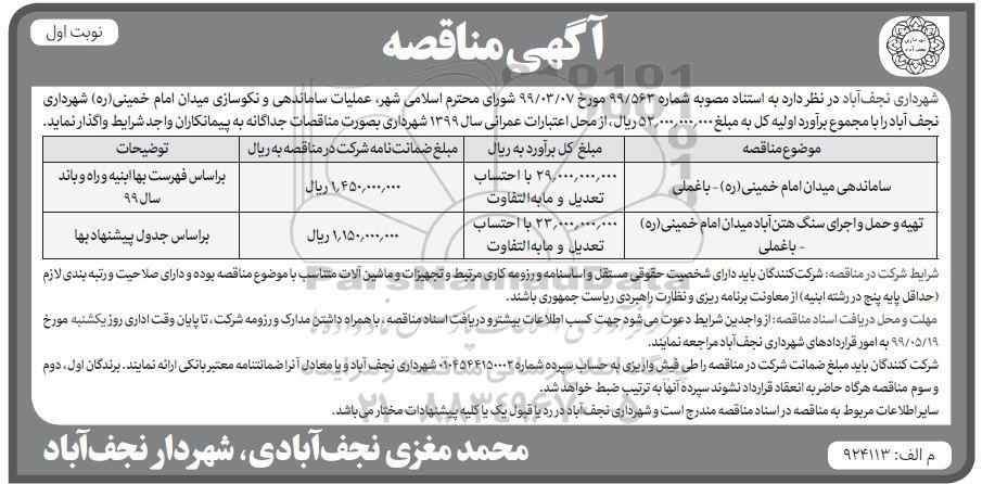 شهرداری نجف آباد در نظر دارد به استناد مصوبه شماره 99/563 مورخ 99.3.7 شورای محترم اسلامی شهر، عملیات ساماندهی و نکوسازی میدان امام خمینی ره  شهرداری نجف آباد را با مجموع برآورد اولیه به مبلغ 52.000.000.000 ریال  از محل اعتبارات عمرانی سال 1399 شهرداری بصورت مناقصات جداگانه به پیمانکاران واجد شرایط واگذار نماید.