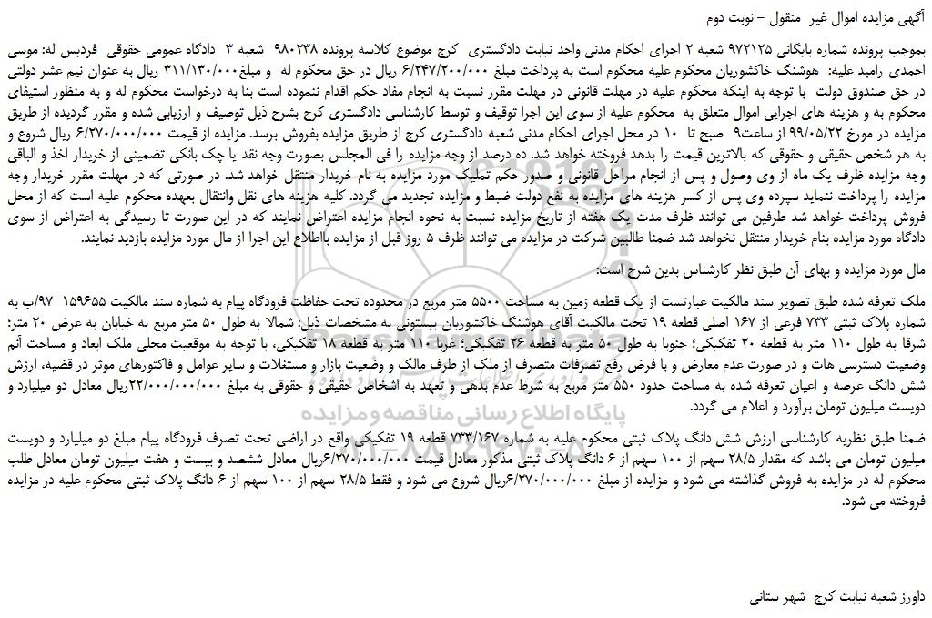بموجب پرونده شماره بایگانی 972125 شعبه 2 اجرای احکام مدنی واحد نیابت دادگستری کرج موضوع کلاسه پرونده 980238 شعبه 3 دادگاه عمومی حقوقی فردیس له: موسی احمدی رامبد علیه: هوشنگ خاکشوریان محکوم علیه محکوم است به پرداخت مبلغ 6/247/200/000 ریال در حق محکوم له و مبلغ311/130/000 ریال به عنوان نیم عشر دولتی در حق صندوق دولت با توجه به اینکه محکوم علیه در مهلت قانونی در مهلت مقرر نسبت به انجام مفاد حکم اقدام ننموده است بنا به درخواست محکوم له و به منظور استیفای محکوم به و هزینه های اجرایی اموال متعلق به محکوم علیه از سوی این اجرا توقیف و توسط کارشناسی دادگستری کرج بشرح ذیل توصیف و ارزیابی شده و مقرر گردیده از طریق مزایده در مورخ 99/05/22 از ساعت9 صبح تا 10 در محل اجرای احکام مدنی شعبه دادگستری کرج از طریق مزایده بفروش برسد. مزایده از قیمت 6/270/000/000 ریال شروع و به هر شخص حقیقی و حقوقی که بالاترین قیمت را بدهد فروخته خواهد شد. ده درصد از وجه مزایده را فی المجلس بصورت وجه نقد یا چک بانکی تضمینی از خریدار اخذ و الباقی وجه مزایده ظرف یک ماه از وی وصول و پس از انجام مراحل قانونی و صدور حکم تملیک مورد مزایده به نام خریدار منتقل خواهد شد. در صورتی که در مهلت مقرر خریدار وجه مزایده را پرداخت ننماید سپرده وی پس از کسر هزینه های مزایده به نفع دولت ضبط و مزایده تجدید می گردد. کلیه هزینه های نقل وانتقال بعهده محکوم علیه است که از محل فروش پرداخت خواهد شد طرفین می توانند ظرف مدت یک هفته از تاریخ مزایده نسبت به نحوه انجام مزایده اعتراض نمایند که در این صورت تا رسیدگی به اعتراض از سوی دادگاه مورد مزایده بنام خریدار منتقل نخواهد شد ضمنا طالبین شرکت در مزایده می توانند ظرف 5 روز قبل از مزایده بااطلاع این اجرا از مال مورد مزایده بازدید نمایند.