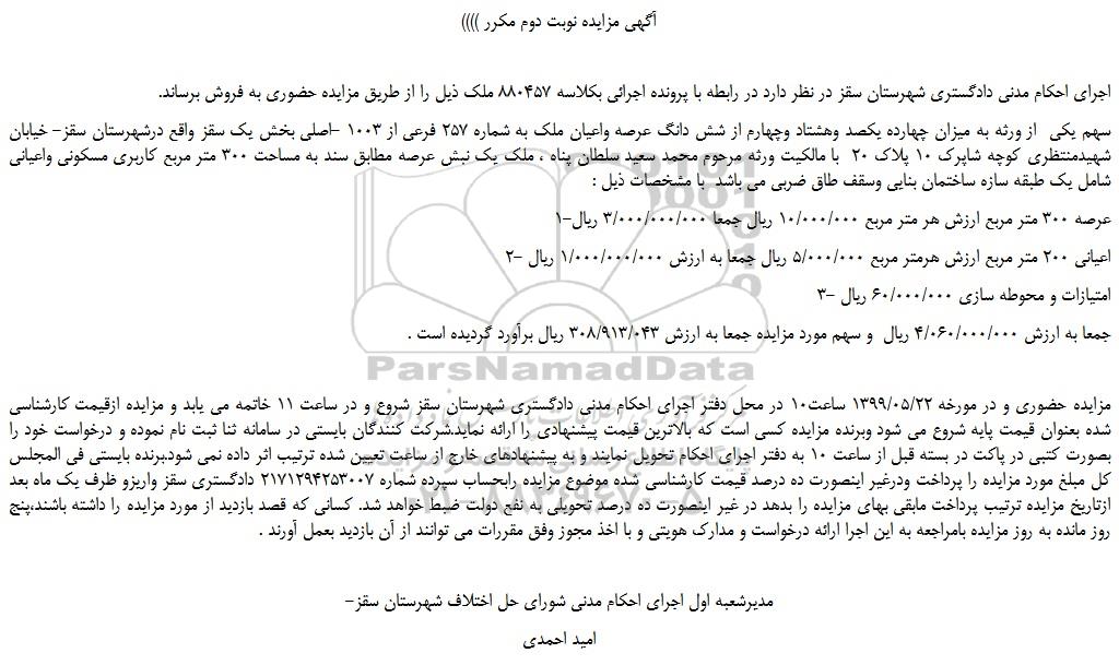 مزایده، مزایده فروش میزان چهارده یکصد وهشتاد وچهارم از شش دانگ عرصه واعیان ملک به شماره 257 فرعی از 1003 -اصلی