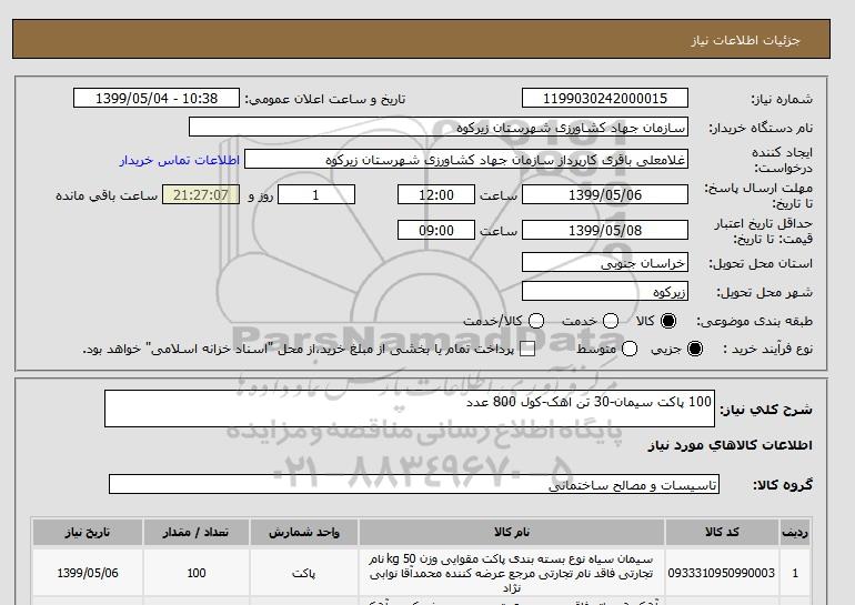 شرح کلی نیاز: 100 پاکت سیمان-30 تن اهک-کول 800 عدد