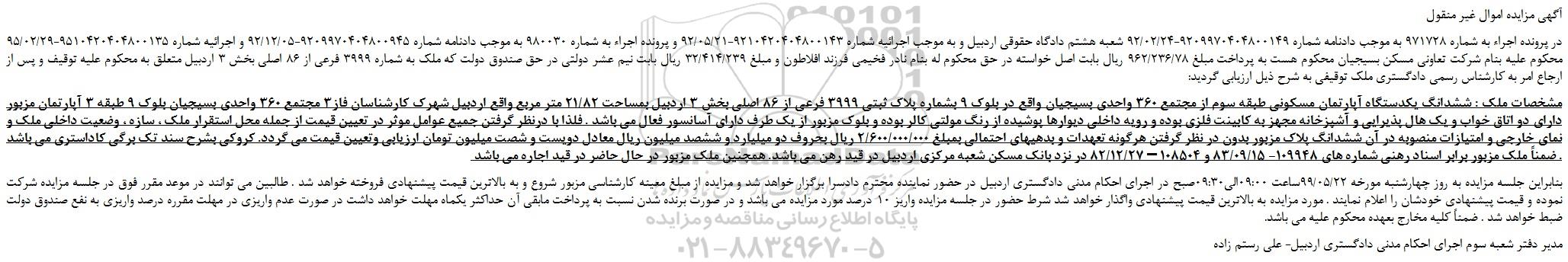 در پرونده اجراء به شماره 971728 به موجب دادنامه شماره 9209970404800149-92/02/24 شعبه هشتم دادگاه حقوقی اردبیل و به موجب اجرائیه شماره 9210420404800143-92/05/21 و پرونده اجراء به شماره 980030 به موجب دادنامه شماره 9209970404800945-92/12/05 و اجرائیه شماره 9510420404800135-95/02/29 محکوم علیه بنام شرکت تعاونی مسکن بسیجیان محکوم هست به پرداخت مبلغ 962/236/78 ریال بابت اصل خواسته در حق محکوم له بنام نادر فخیمی فرزند افلاطون و مبلغ 32/414/239 ریال بابت نیم عشر دولتی در حق صندوق دولت که ملک به شماره 3999 فرعی از 86 اصلی بخش 3 اردبیل متعلق به محکوم علیه توقیف و پس از ارجاع امر به کارشناس رسمی دادگستری ملک توقیفی به شرح ذیل ارزیابی گردید: