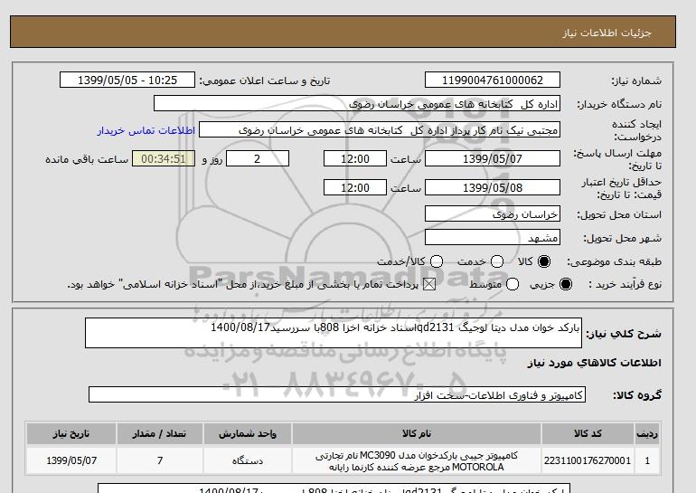 شرح کلی نیاز: بارکد خوان مدل دیتا لوجیگ qd2131اسناد خزانه اخزا 808با سررسید1400/08/17