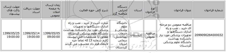 | 2099090264000032 | مناقصه عمومی دو مرحله ای خرید ، نصب و راه اندازی دستگاهها و تجهیزات پزشکی مورد نیاز دانشکده بهداشت دانشگاه علوم پزشکی کردستان | مناقصه عمومی | کردستان | دانشگاه علوم پزشکی و خدمات بهداشتی، درمانی استان کردستان | عبارت است از خرید ، نصب و راه اندازی دستگاهها و تجهیزات پزشکی مورد نیاز دانشکده بهداشت دانشگاه علوم پزشکی کردستان مطابق با مشخصات فنی پیوست (فرم شماره 3) که تماماً جزء لاینفک قرار داد محسوب می گردند . | 1399/05/05 09:00:00 | 1399/05/14 19:00:00 | 1399/05/25 19:00:00 |